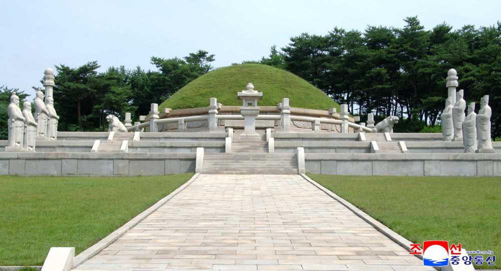 El Mausoleo fue reconstruido excelentemente en 1994 bajo la orientación del gran Líder, camarada Kim Il Sung, y el gran Dirigente, camarada Kim Jong Il.