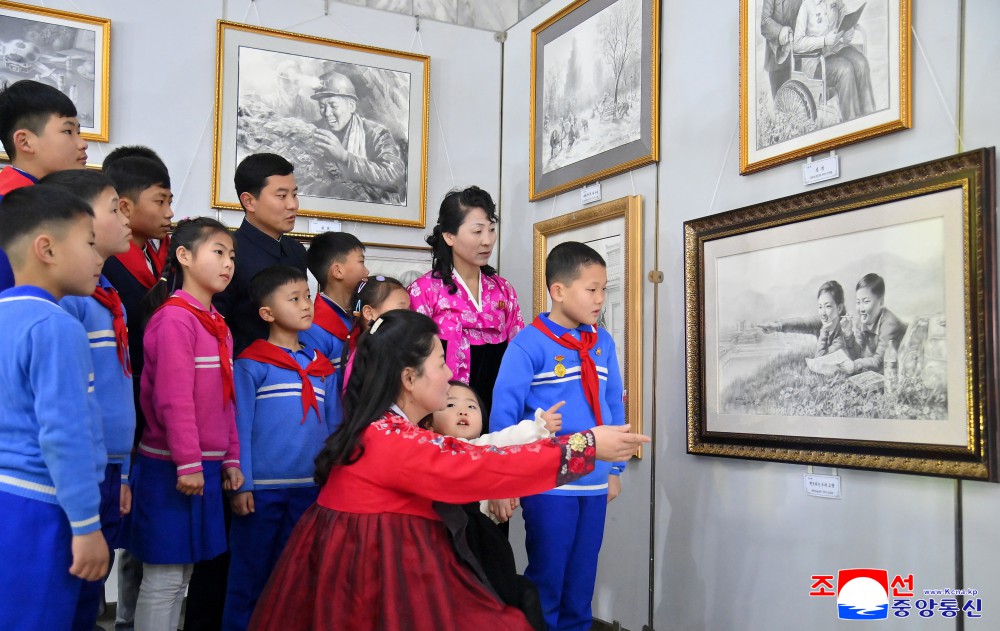 Se ven también las obras que muestran el espíritu revolucionario e indoblegable lucha de los habitantes y los oficiales y soldados del Ejército Popular que marchan vigorosamente hacia el glorioso congreso partidista y los armamentos todopoderosos de las fuerzas armadas de la República que ostentan a todo el mundo su fama como el ejército poderoso de carácter revolucionario.