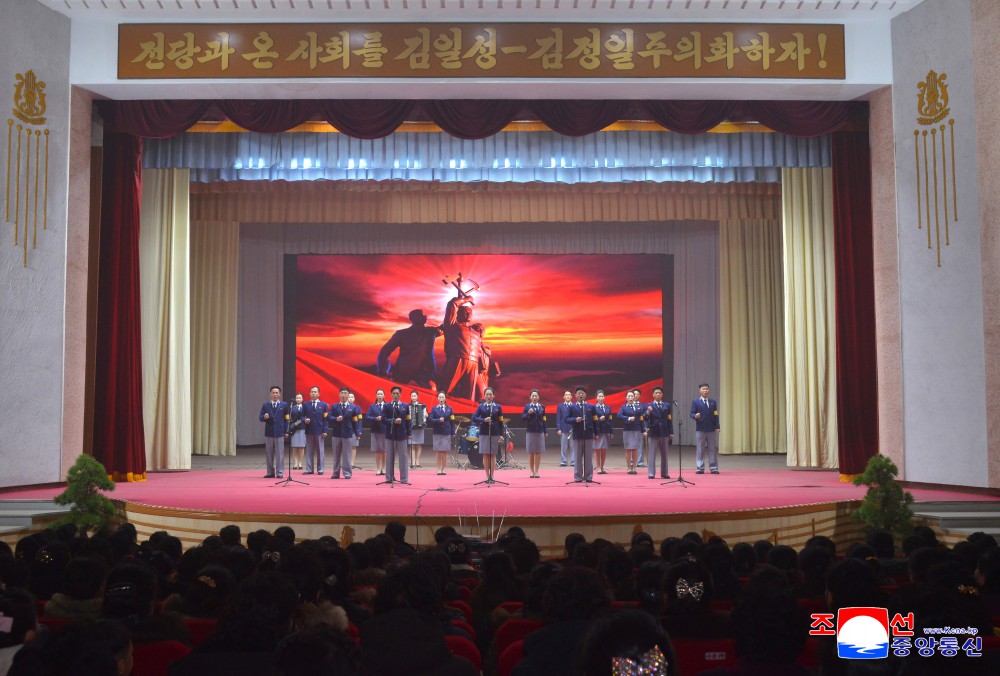 El grupo de agitación artística móvil de la ciudad de Samjiyon y los grupos artísticos de la Fábrica de Procesamiento de Patatas del distrito de Taehongdan y la Granja de Verduras de Mojong de la ciudad de Hyesan transmitieron la consagración del estimado camarada Kim Jong Un quien conduce al frente la gran empresa de transformación local.