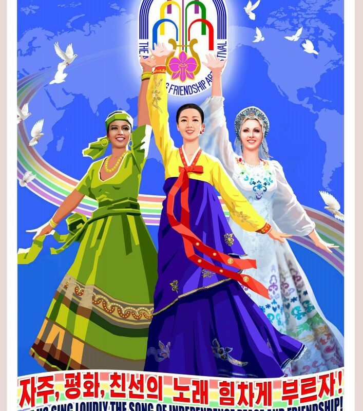 Los afiches con el emblema del evento y las letras «34º Festival Artístico de Amistad Abril en Primavera» describen la ferviente aspiración del pueblo coreano y los demás progresistas del mundo de celebrar con solemnidad la fiesta de abril como un gran júbilo común de la humanidad.